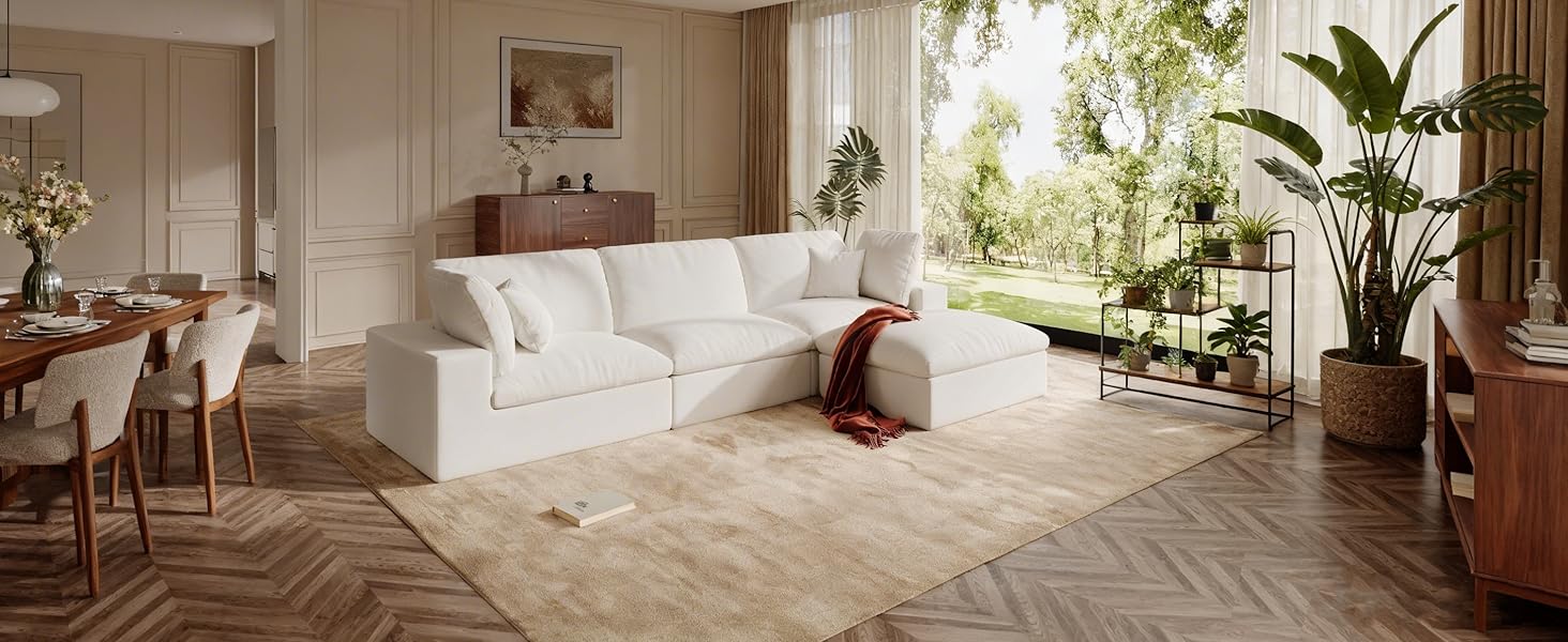 121" L-Shaped Modular Sectional Sofa with Ottoman, No Assembly Required, Chenille Warm White | Breathable Material